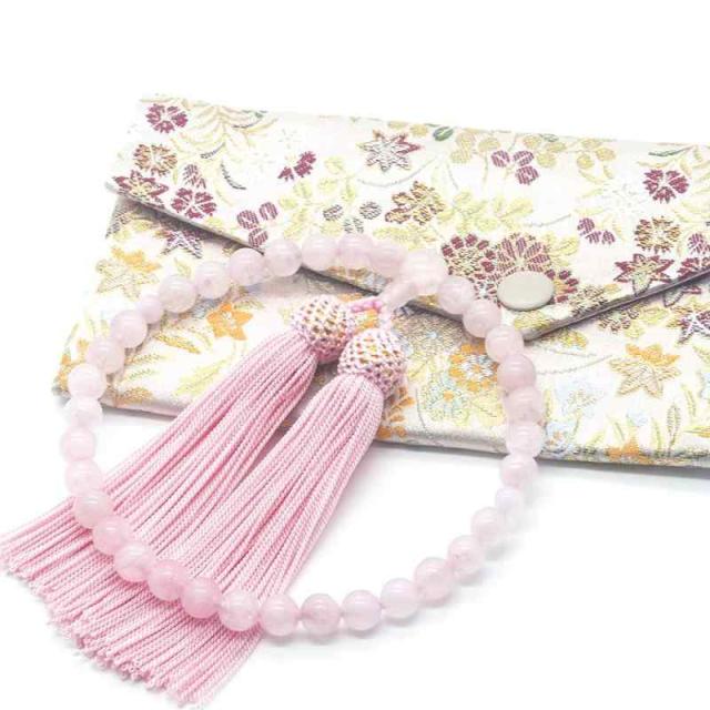 【素材】:●親玉:ローズクォーツ(約10ミリ) ●主玉:ローズクォーツ(約7ミリ)●天玉:ローズクォーツ(約5ミリ)●数珠袋:素敵な金襴 ●寸法: 約16×10cm ●色:ピンク ●数珠入れ対応のお念珠:8mmまでの女性用片手数珠