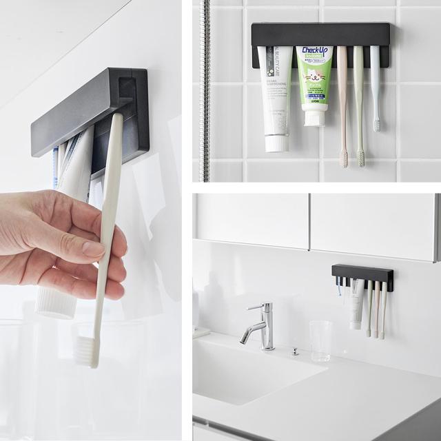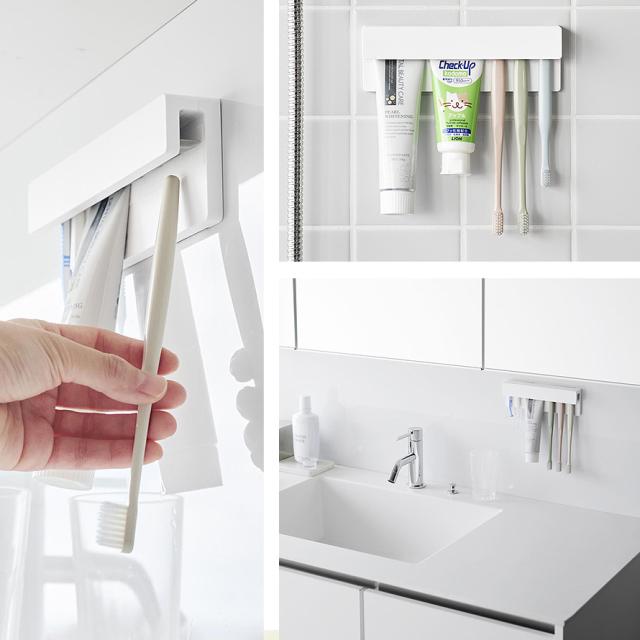 フィルムフックで簡単取り付け。下から差し込むだけで収納できる、差し込み式歯ブラシ&チューブホルダー。