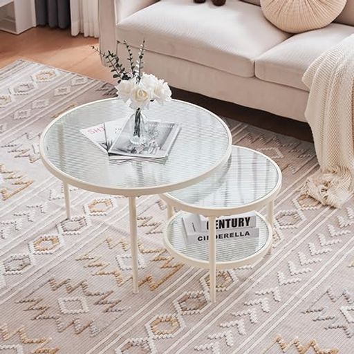 【サイズ】テーブル(大):幅70x奥行70x高さ45cm (アジャスター高さ: 0.5~2.5cm) テーブル(小):幅45x奥行45x高さ40cm(アジャスター高さ: 0.5~2.5cm)【耐荷重】30kg【素材】ガラス、スチール(フレーム)、粉末塗装(スチール部分) 。【カラー】 ホワイト【重量】約10.25kg 【梱包重量】約12.3kg 【組立品/完成品】: 組立品