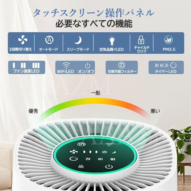 この空気清浄器は、Wi-Fi対応でスマートAPP制御が可能な高性能モデルです。マイナスイオンを放出してホルムアルデヒドを除去し、PM2.5粒子や臭いを効果的に対策します。