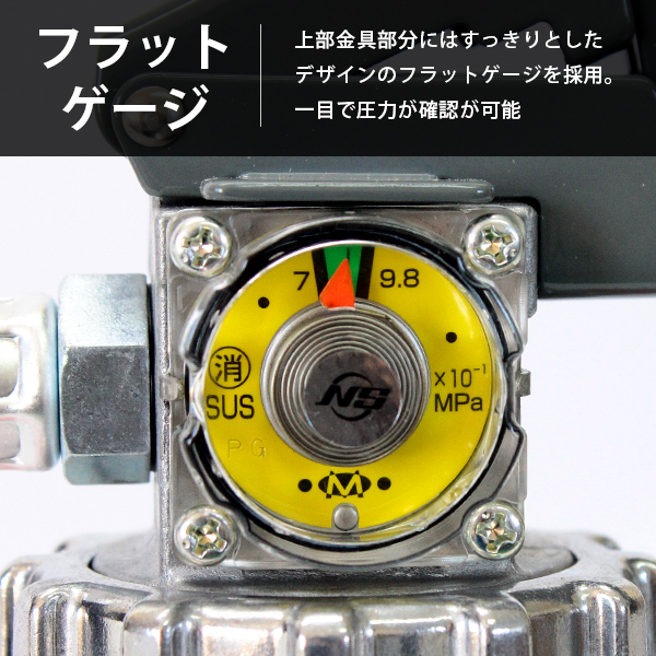 上部金具部分にはすっきりとしたデザインのフラットゲージを採用。一目で圧力が確認できます
