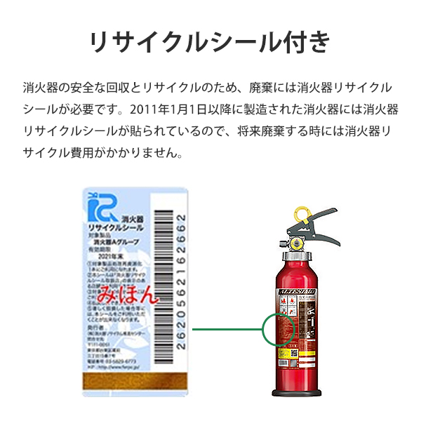 消火器の安全な回収とリサイクルのため、廃棄には消火器リサイクルシールが必要です。2011年1月1日以降に製造された消火器には消火器リサイクルシールが貼られているので、将来廃棄する時には消火器リサイクル費用がかかりません。