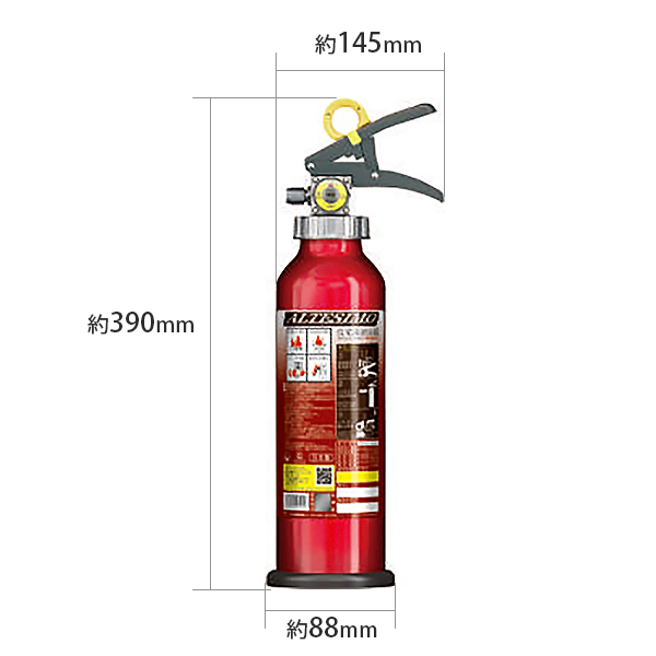 型番 MEA4H 規格 日本消防検定協会国家検定合格品 業務用消火器 検定型式番号 消第26〜33号 消火薬剤 粉末ABC 消火薬剤量 1.2kg 加圧ガス 窒素(ノンフロン) 使用温度範囲 −30℃〜+40℃ 放射時間/距離 約16秒(20℃)/3〜5m(20℃) 適用火災 普通火災/天ぷら油火災/ストーブ火災/電気火災 製造国 日本 寸法 幅145mm×奥行103mm×高390mm 質量 約1.9kg