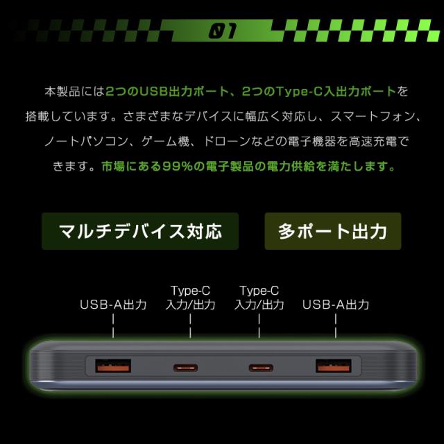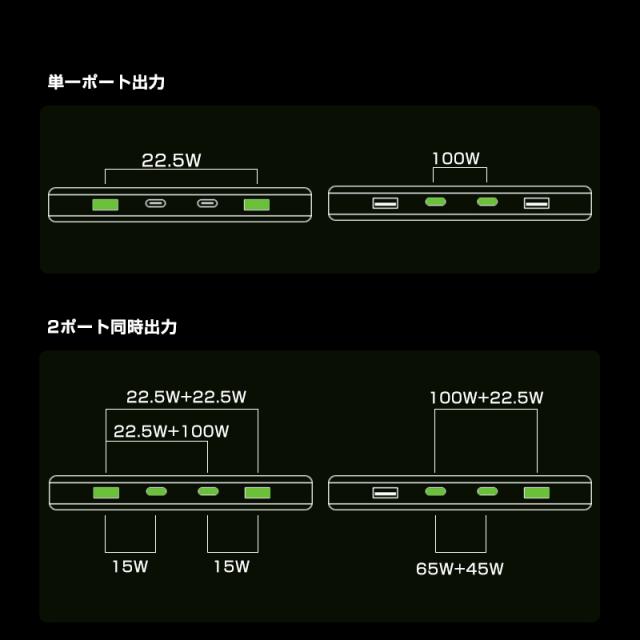 2つのType-C出力ポートとも100Wの出力をサポートするPD(USB Power Delivery)規格のため、設備の充電がもっと高速になり、時短充電を実現します。スマホやタブレットだけではなく、ノートPCの充電にも対応できます。