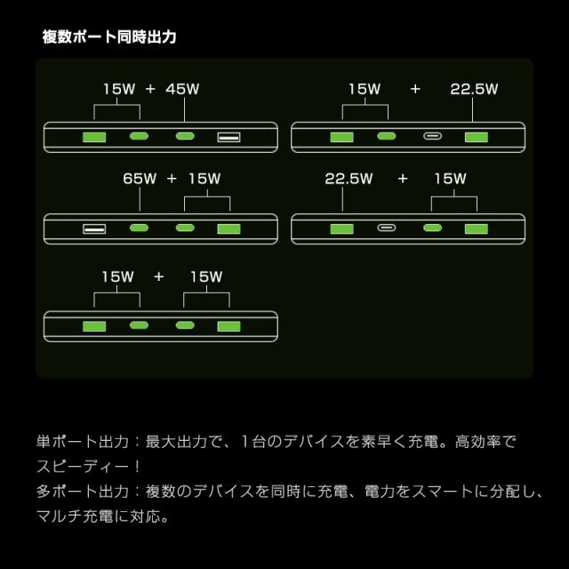 2つのType-C出力ポート+2つのUSB-A出力ポートで4台の設備を同時に充電できます。出張や旅行、電車での移動中などさまざまなシーンで使える便利なアイテムです。