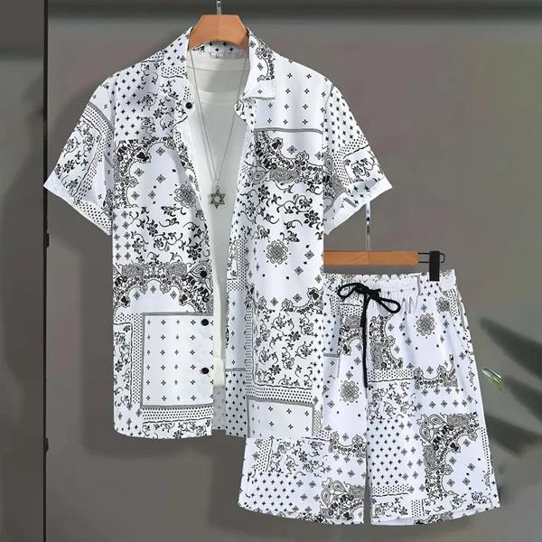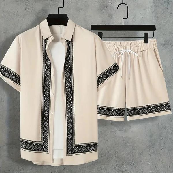 メンズレトロテクスチャードホリデースーツ,プリントボーダーシャツ,半袖ショーツ,通気性プールスーツ,新品,2ピース,2024
