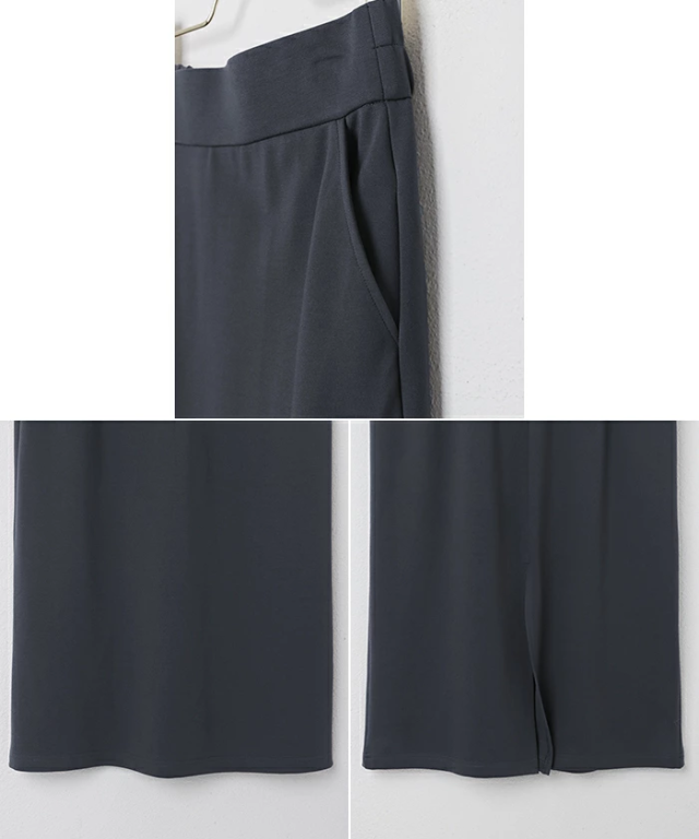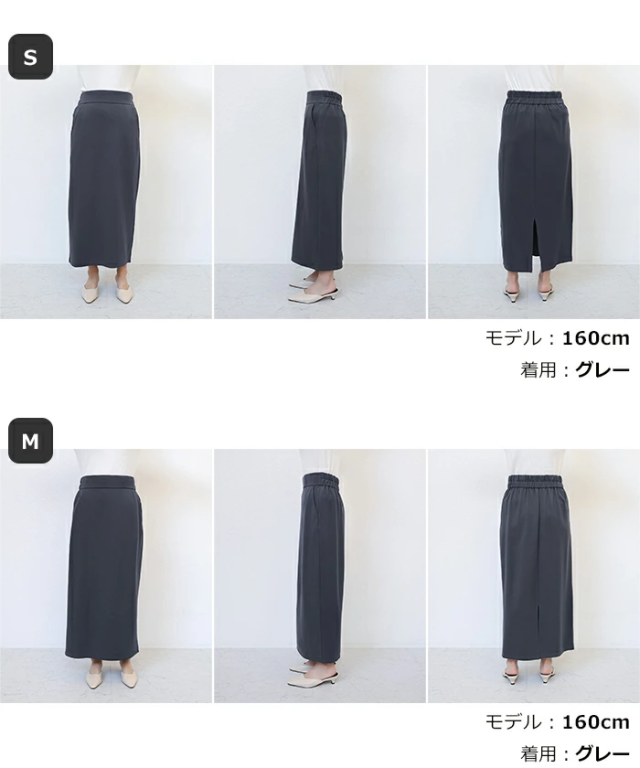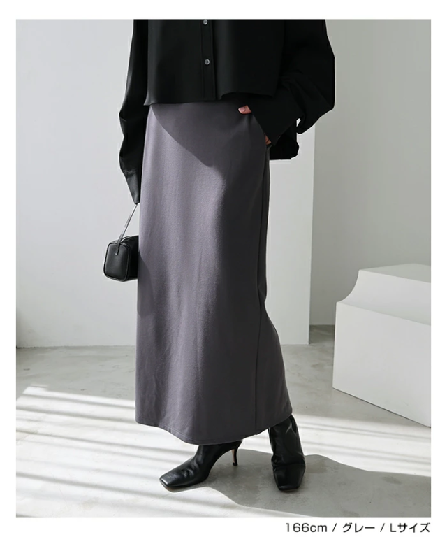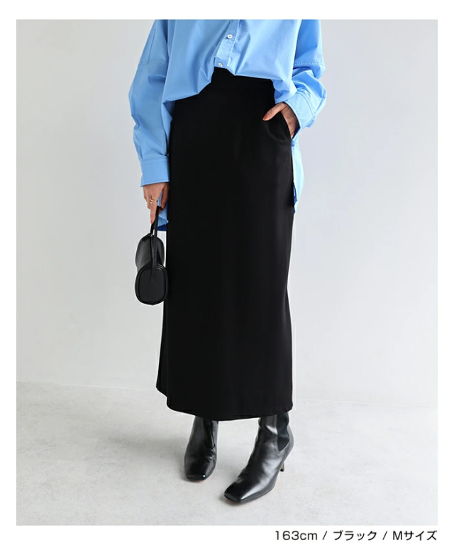 とろみ感のある柔らかなポンチ素材が心地よい、楽ちん&キレイ見えする人気のボトムシリーズに、《タイトスカート》タイプが登場です。シンプルで履き心地の良い、合わせやすいストレートスカート。すっきりとしたIラインながらも、体のラインを拾いにくいサイジングにこだわりました。なめらかで程よい厚みのポンチ素材を採用し、しっとり落ち感のあるニュアンスが上品な印象にみせてくれる1枚です。太めのウエストベルトがお腹をしっかりとホールドしてくれるウエストゴム・デザイン。便利なサイドポケット付き。バックスリット入りで足さばきも◎