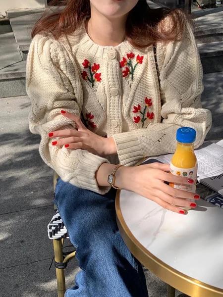 レトロ刺繍ニットオープンカーディガン長袖女性のエレガントなトップ秋冬ソフトスタイル和風ポリエステル繊維