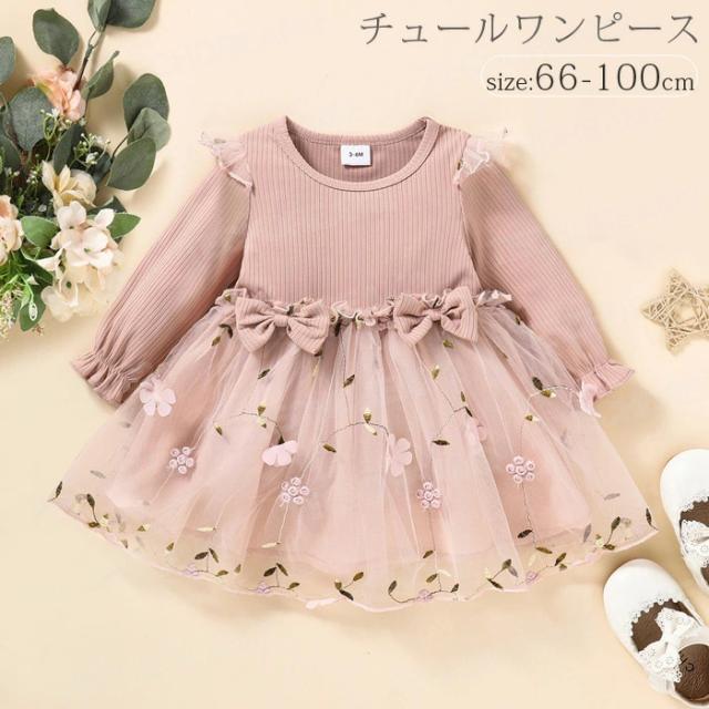 チュールワンピース ドレス 女の子 誕生日 結婚式 ハーフバースデー ベビー 子供 キッズ フリル 花柄チュールワンピース リボン付き 子ども 赤ちゃん 刺繍 長袖ワンピース セレモニードレス 0歳 1歳 2歳 3歳