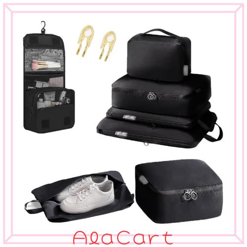 【トラベルポーチ 9セット】衣類圧縮収納ポーチ×2(M/L)、非圧縮衣類収納袋×1、下着靴下用ポーチ×2、シューズバッグ×1、掛け式化粧ポーチ×1、折りたたみハンガー×2。9点セットのトラベルポーチがあるから、細かく分けてすっきり整理でき、収納が抜群です。着ていない服衣類や汚れた衣類、洗面用具やシューズなども分けて衛生的に収納できます。