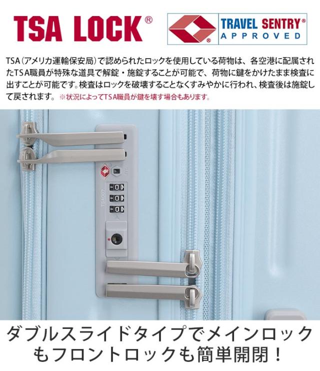 ファスナー式の開閉部は安心のTSAロック機能搭載!鍵の紛失の心配不要なダイヤル式ロック。ダブルスライドタイプでメインロックもフロントロックも簡単に施錠・解錠可能です。
