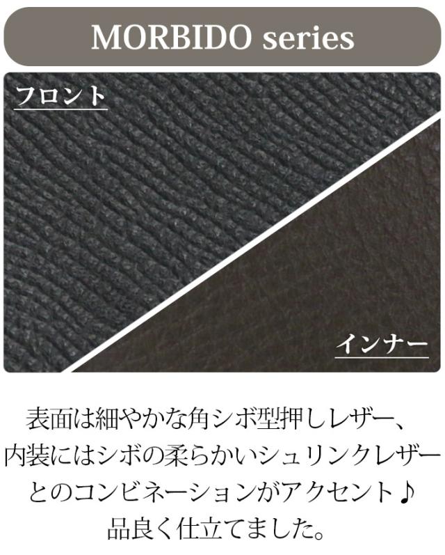 内外装とも国産の牛革を使用しており、表面は細やかな角シボ型押しレザー、内装にはシボの柔らかいシュリンクレザーとのコンビネーションアクセントで品良く仕立てた『MORBIDO(モルビド)』シリーズ。