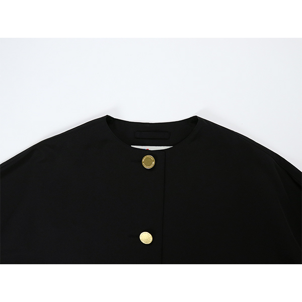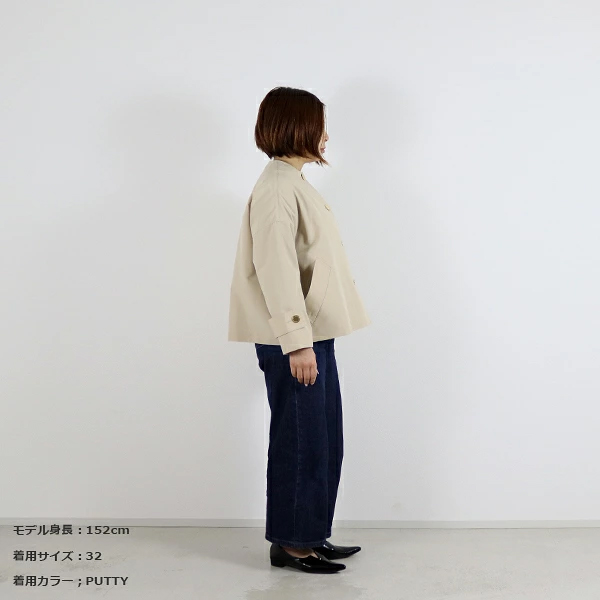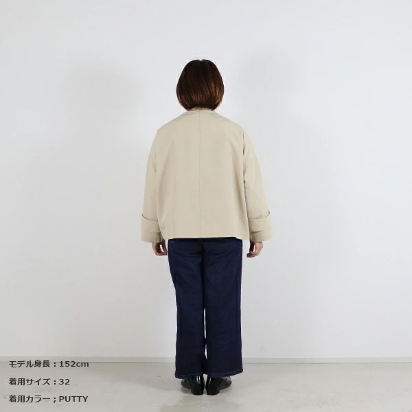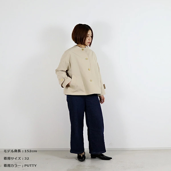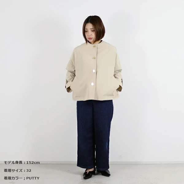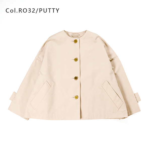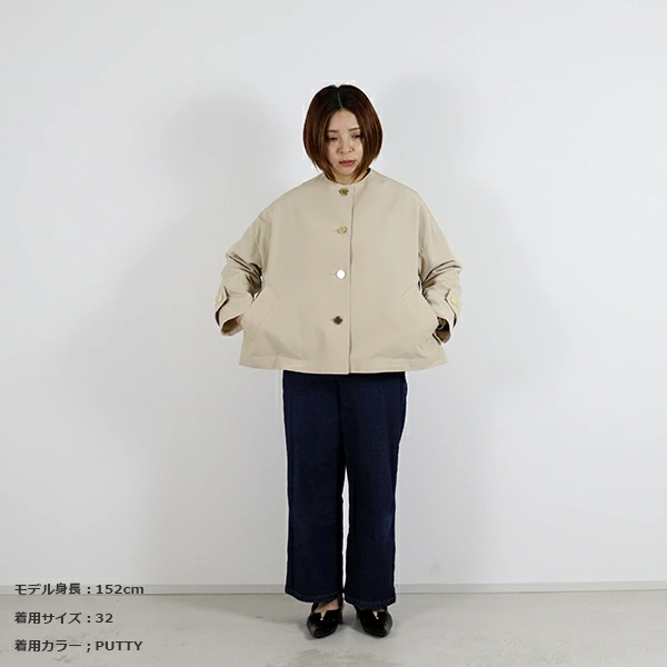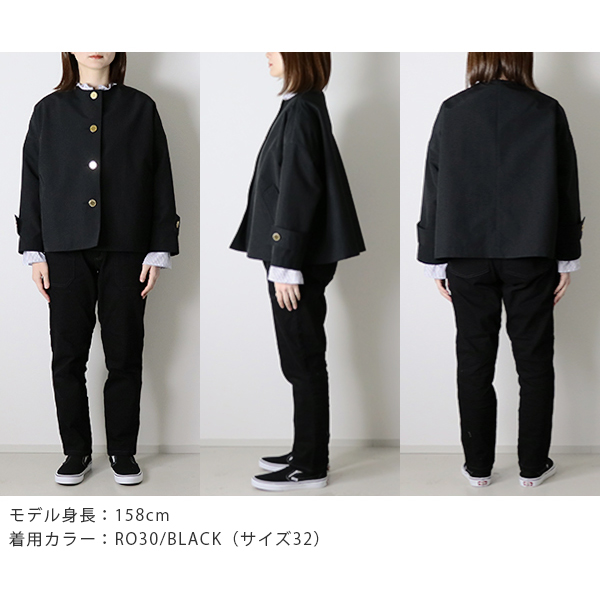 MALTON(マールトン)と人気を二分するドロップショルダーでオーバーサイズのコート、 MALTON NO COLLAR(マールトン ノーカラー)に軽快なショート丈モデルが新登場。 こちらのマールトン ノーカラー ショートは、きちんと感がありながら、 ゆったりとした優しいシルエットが魅力で、リュクスなドレス感のある装いから、 カジュアルなデニムスタイルまで活躍する着る人を選ばない万能アイテムです。 上質なコットンとポリエステルの糸を丁寧に織り上げた、こちらのRO素材はしっかりとしたハリと光沢が特長で、 立体的なシルエットが際立ちます。 フラットなゴールドに輝くボタンが、きりりと全体の印象を引き締めます。 | |||||||||