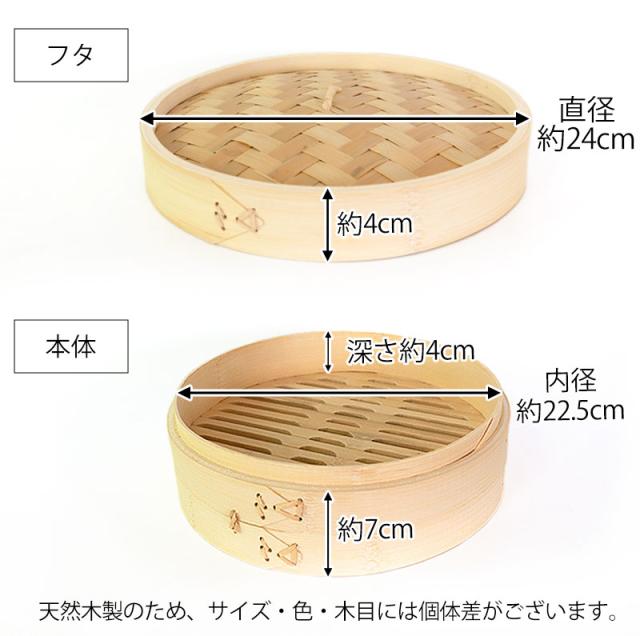 せいろ蓋:直径24cm×高さ4cm 本体1段分:直径24cm×高さ7cm(内径22.5cm×深さ4cm) 2段セット:直径24cm×高さ15.5cm 受け台:直径28cm(穴の直径15cm) お鍋の目安サイズ:26cm〜27.5cm |