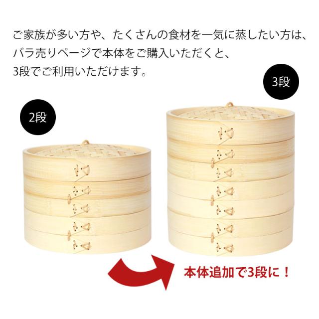 はじめての方におすすめのお得なせいろセットです。 素材の旨みを引き出す「せいろ」で、簡単に、ふっくら美味しい蒸し料理を楽しみましょう! こちらのお得なセット販売で、手軽に本格的な蒸し料理を始めてみませんか? ■蒸篭(せいろ)・・・素材の美味しさを引き出す、昔ながらの調理器 蒸篭は、長年愛され続けてきたシンプルな木製の調理器具です。 木製ならではの調湿効果により、食材をふっくらと蒸し上げ、シュウマイや中華まん、ギョウザ、温野菜など、さまざまな蒸し料理が美味しく仕上がります。 蒸し器と異なり、せいろは木製の特性で水滴が食材に落ちにくく、冷めても水っぽくならず、美味しさが続きます。 また、蒸し料理は素材の旨みや栄養分をしっかりと閉じ込め、柔らかく仕上がるため、お弁当のおかずにもぴったりです。 蒸し料理は焦がす心配がなく、手間も少ないため、気軽に楽しめます。 さらに、せいろは積み重ねて使うことで、複数の料理を一度に調理可能。 2段以上の重ね使いがおすすめで、違う食材を一気に蒸せるのでとても便利です。 ■2段せいろセット(蓋+本体2段分)と専用受け台(蒸し板)付き せいろと合わせて使える専用の受け台がセットになっているため、ご家庭の鍋やフライパンですぐにせいろ料理をお楽しみいただけます。 「鍋のサイズが合わない」というお悩みを解決するドーナツ型の蒸し板は、鍋の上に安定してせいろを置け、効率よく蒸気を送り上段まで温めます。 せいろ専用鍋を使わなくても、ご家庭の調理器具で簡単に蒸し料理を始められる便利なセットです。 |