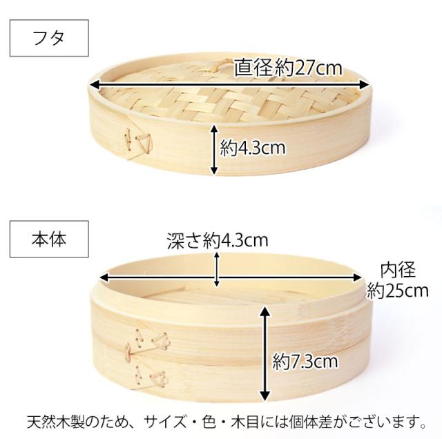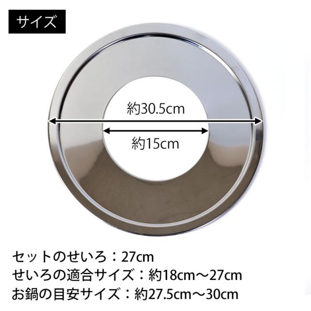 せいろ蓋:直径27cm×高さ4.3cm 本体1段分:直径27cm×高さ7.3cm(内径25cm×深さ4.3cm) 2段セット:直径27cm×高さ16.5cm 受け台:直径30.5cm(穴の直径15cm) お鍋の目安サイズ:27.5cm〜30cm |