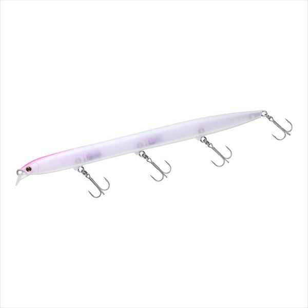 小沼正弥監修。密かに爆れ。バチ、サヨリ、シラス、激スレパターン対応、極細シルエットの水面直下攻略型ぶっ飛びシャローランナー。細身・小型ベイトに偏食している時、激スレ時に最適。バチ、サヨリ、シラスはもとより、イワシや稚アユ等の小型ベイトパターンにベストマッチな極スリムシルエット。高レスポンス&スレに強いタイトウォブンロール+テールスライドアクションで、低速〜高速まで全てのリトリーブに対応。ロッドポジションとリトリーブ速度の組み合わせで水面直下〜約30cmが有効レンジ。風雨等でI字系スリムプラグが太刀打ちできない状況でも、一枚下のレンジでしっかりアピールできる。極細ボディながら磁着重心移動を前後にダブルで搭載し、「スリムミノーは飛ばない」イメージをくつがえす快適なキャスタビリティと立ち上がり性能を両立。