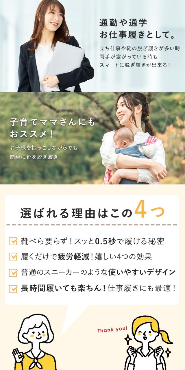 | 結ばない紐靴とスリッポンから選べる! お仕事履きや、両手が塞がるママさんや妊婦さんにもおすすめ! |