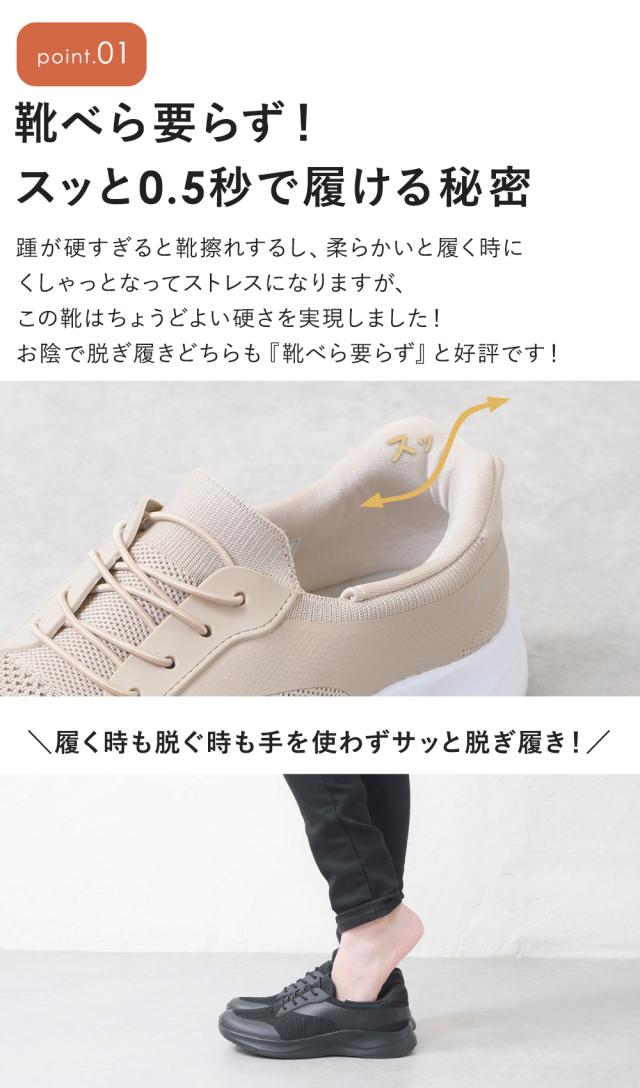 手を使わずに履ける靴 レディース 立ったまま履ける靴 スリッポン スニーカー 室内シューズ 結ばない紐 ほどけない 伸びる 靴紐 やわらかい 歩きやすい 立ち仕事 疲れない 履きやすい 軽い 室内履き 外履き 通勤 大きいサイズ 黒 ブラック 母の日 プレゼント
