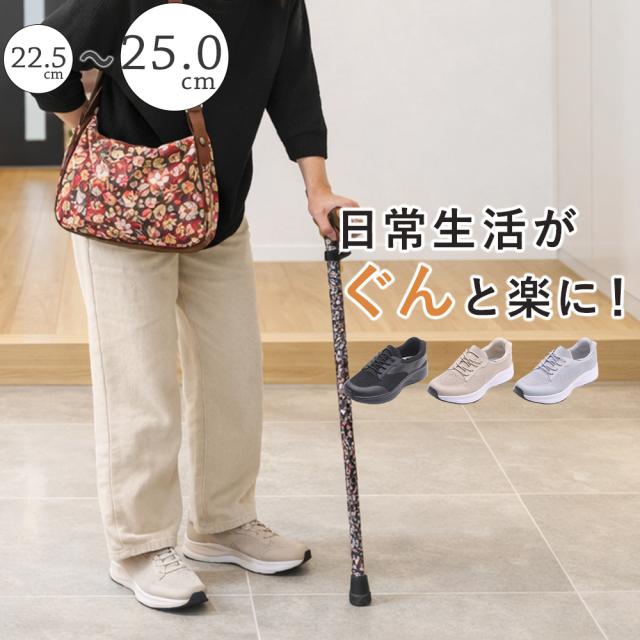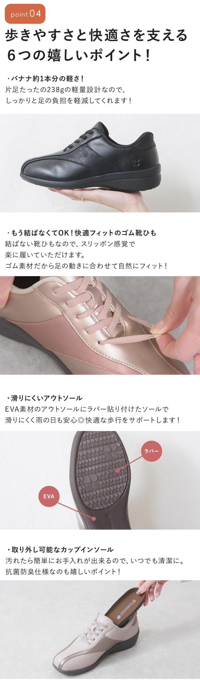 結ばないゴム紐で楽ちん! 歩きながら、姿勢のサポート、肩・腰のコリの軽減もできるBMZインソールを使用。 |