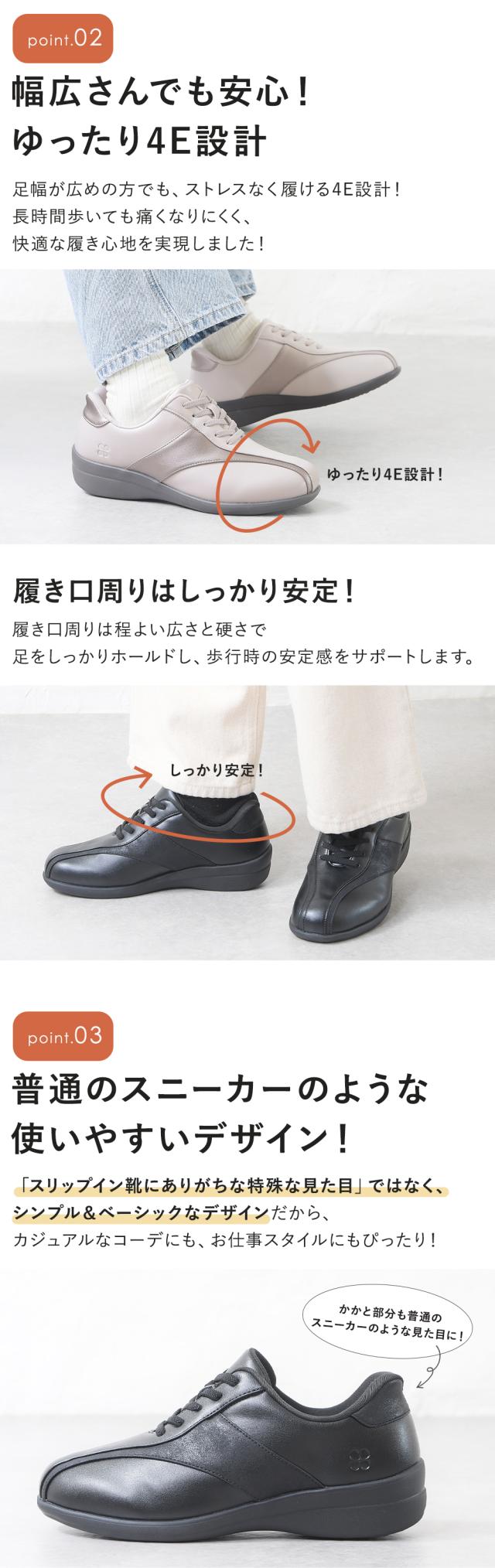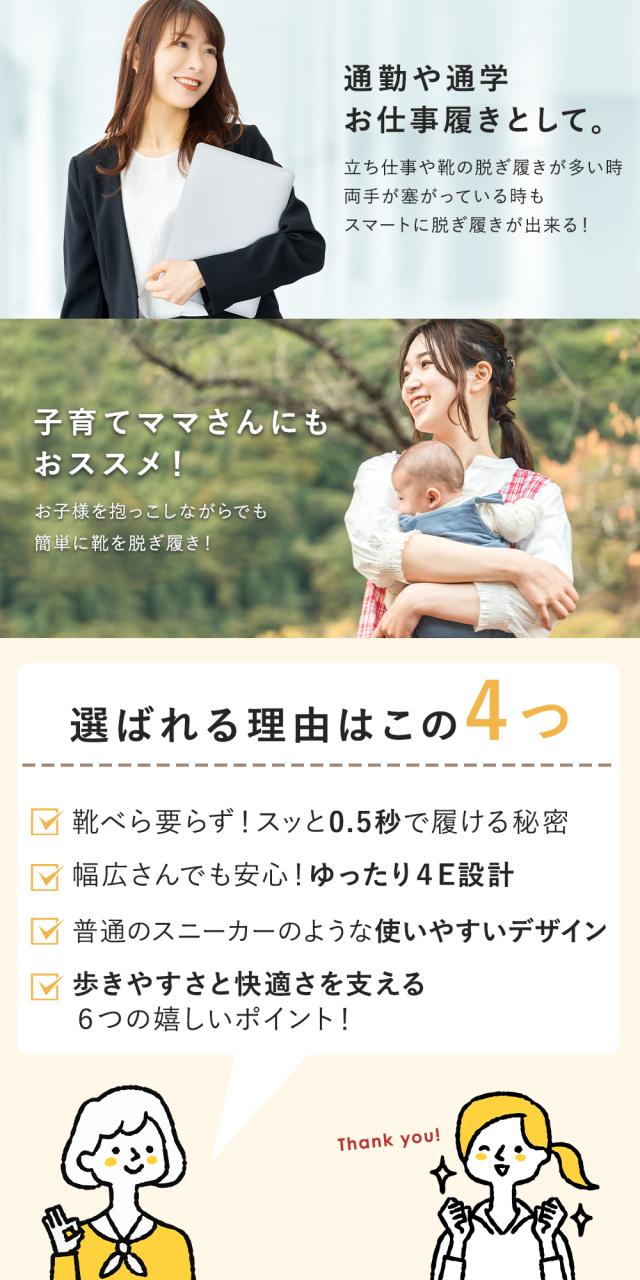 | 結ばない紐靴とスリッポンから選べる! お仕事履きや、両手が塞がるママさんや妊婦さんにもおすすめ! |