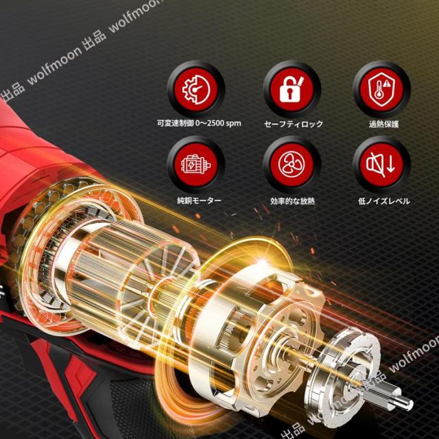 LED作業灯機能付きで、作業するときに、ライトが点灯して、薄暗い場所や奥まった場所の作業もラクラクです。耐衝撃性のシェルだけではなく、本体の中央にあるユニークなゴム製の接続設計も、振動を低減する役割を果たします。また、柔らかいゴムゴム製のハンドルは振動も吸収し、負担を軽減します。長時間使っても疲れにくいです。