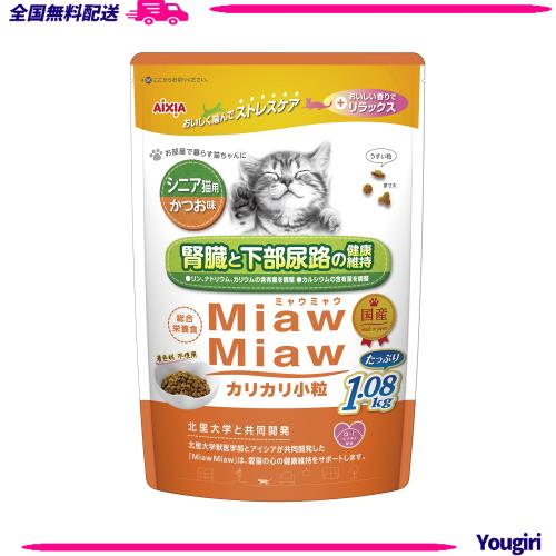 ミャウミャウ (MiawMiaw) カリカリ 小粒 腎臓と下部尿路の健康維持 1.08kg シニア猫用 かつお味 キャットフード ドライフード