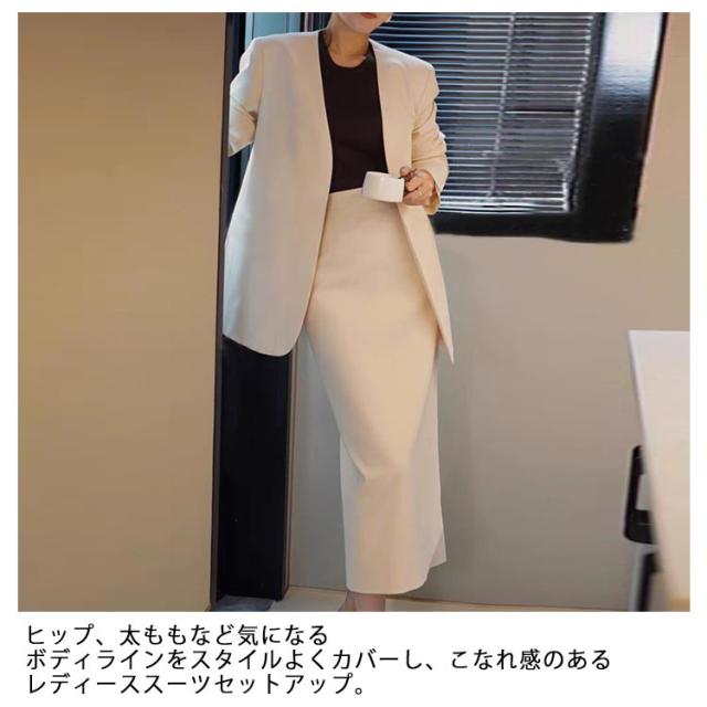 | 大人女性のためのスカートスーツセット。 たにはめったいに見えないロング丈スカートスーツ、ノーカラージャケットでスッキリした印象。 ヒップ、太ももなど気になるボディラインをスタイルよくカバーし、こなれ感のあるレディーススーツセットアップ。 オフィススタイル・フォーマルスタイル・お出かけスタイル・カジュアルスタイルすべてにぴったりのスカートスーツです。 | |