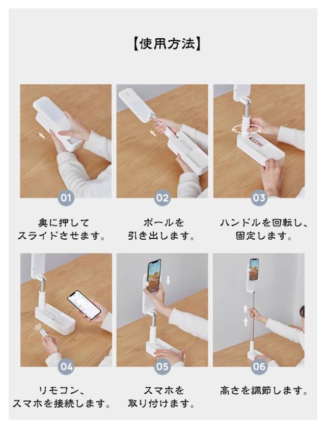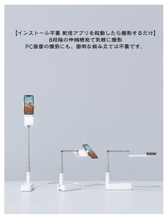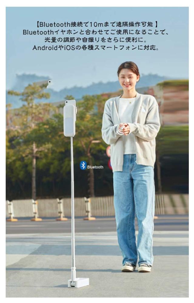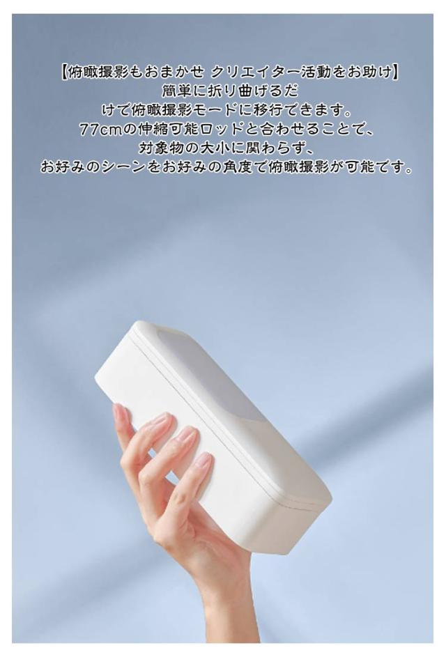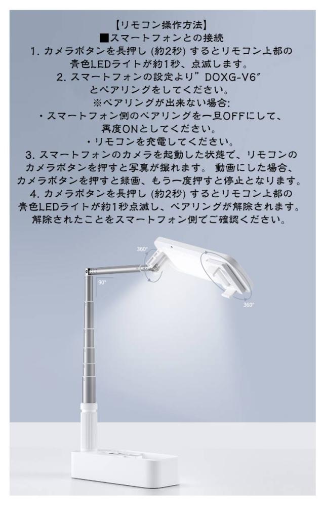 | LED ライト付き 折りたたみ式 USB充電式 360°回転可能 多機能セルフィースティック 【インストール不要 配信アプリを起動したら撮影するだけ】 8段階の伸縮機能で気軽に撮影 PC画面の撮影にも、面倒な組み立ては不要です。 【俯瞰撮影もおまかせ クリエイター活動をお助け】 簡単に折り曲げるだけで俯瞰撮影モードに移行できます。 77cmの伸縮可能ロッドと合わせることで、対象物の大小に関わらず、 お好みのシーンをお好みの角度で俯瞰撮影が可能です。 【たった1秒間の たった1つの操作で異なるシーンを隙間なく撮影可能】 カメラ位置の変更も、たった1つの操作で大丈夫。 異なる場面でもそのまま隙間なく撮影ができます。 【充電にも対応 撮影は無線のままで】 1000mAhの大容量バッテリーを搭載し、配線の手間を減らしました。 4~12時間の長時間無線撮影が可能です。 動画撮影に新たな視点を。 【Bluetooth接続で10mまで遠隔操作可能 】 Bluetoothイヤホンと合わせてご使用になることで、 光量の調節や自撮りをさらに便利に。 AndroidやiOSの各種スマートフォンに対応。 【前後に全方向立体ライトを搭載 美顔ライトとしても使用できます】 100個ものLEDレンズを搭載。細やかにあたりを照らします。 7つの照明モードで、温かみも立体感も、美肌効果も思いのままに。 【2軸360°回転機構】 3D設計による雲台により、360°自由に回転可能です。どんな撮影でも、もっとお手軽に。 配信時以外にも、電気スタンドとしてお使いになれます。 ・直立で自撮り用にも ・45°の広角撮影にも ・俯瞰撮影にも 【使用方法】 1.奥に押してスライドさせます。 2.ポールを引き出します。 3.ハンドルを回転し、固定します。 4.リモコン、スマホを接続します。 5.スマホを取り付けます。 6.高さを調節します。 【リモコン操作方法】 ■スマートフォンとの接続 1. カメラボタンを長押し (約2秒) するとリモコン上部の青色LEDライトが約1秒、点滅します。 2. スマートフォンの設定より”DOXG-V6″とペアリングをしてください。 ※ペアリングが出来ない場合: ・スマートフォン側のペアリングを一旦OFFにして、再度ONとしてください。 ・リモコンを充電してください | |