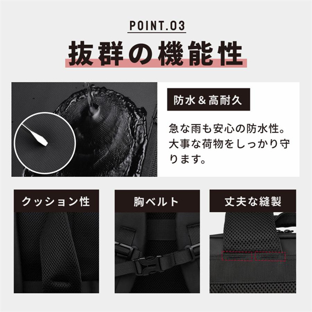 肩や背中の負担を効果的に軽減するクッション設計で、長時間の移動でも快適。しっかりとした背負い心地が自慢です。