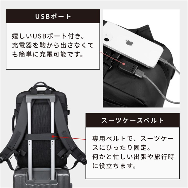 外部USBポートを搭載しているので、リュック内のモバイルバッテリーと接続すれば、スマホを背負ったまま簡単に充電可能。盗難防止の隠しポケットもあり、貴重品を安全に保護します。取り外し可能なケーブルで、メンテナンス時にも便利です。