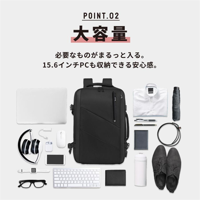 サイズは46×30×14cm(拡張前)/46×30×24cm(拡張後)と大容量で、15.6インチのノートPC、A4書類、2〜3日分の衣類を余裕で収納できます。さらにキャリーオン機能付きで、出張や旅行も快適です。