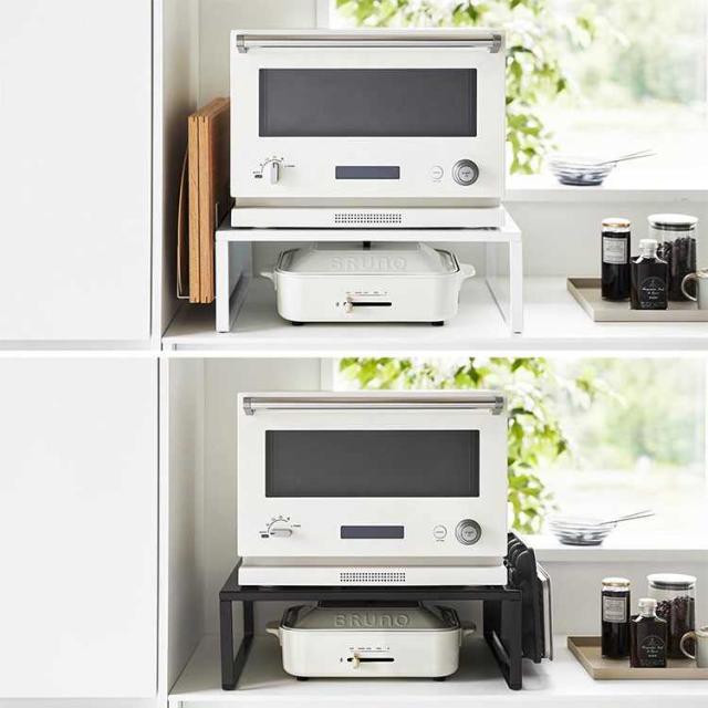 置き場に困るホットプレートやカセットコンロの収納にピッタリです。縦にスペースを作ることで、見た目もスッキリ収納できます。スチールパネルは、キッチンレイアウトに合わせて左右どちらでも取り付け可能です。別売りのキッチントレーホルダー2個組を追加して、オーブンやホットプレートの天板をまとめて収納するのもおすすめです。