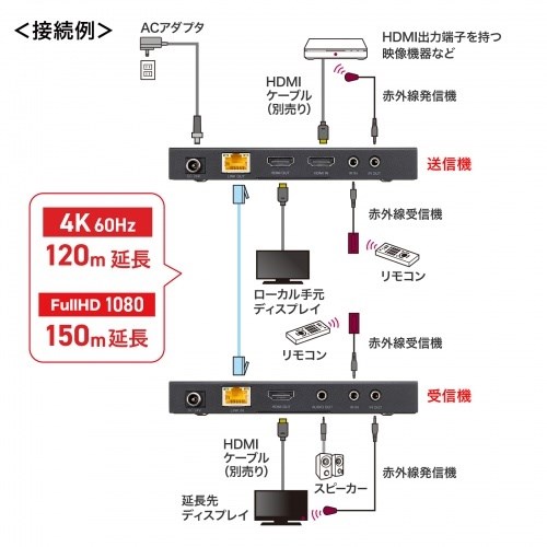 ●4K/60Hz解像度のHDMI信号を最大120mまで、または1080p(1920×1080ドット)解像度であれば最大150mまで延長することができるHDMIエクステンダーです。