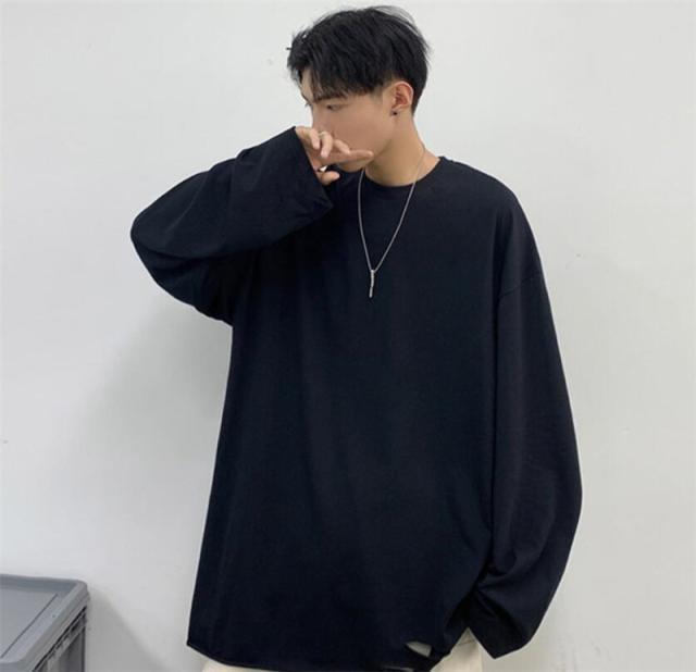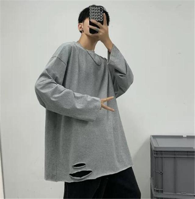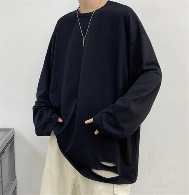 Tシャツ メンズ 長袖 カットソー 綿 クルーネック ブラウス インナー ダメージ加工 切り替え 無地 ゆったり 体型カバー スポ