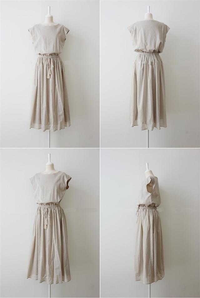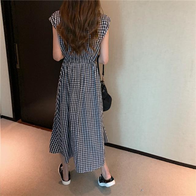 ワンピース 麻混 リネン混 レディース ロング丈 ゆったり 春夏 涼しい チェック柄 ウエストゴム フレア リボン付き 体型カバー