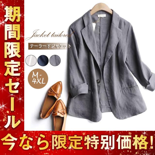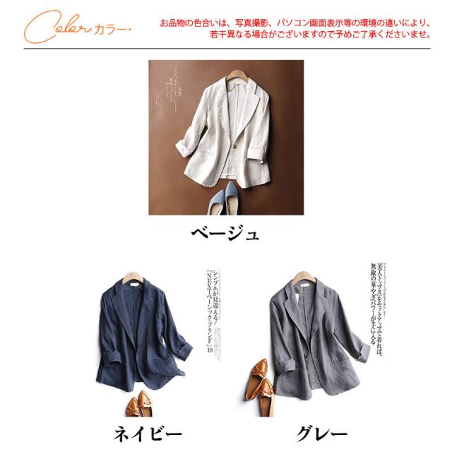 テーラードジャケット レディース スーツ ジャケット 七分袖 綿麻 リンネ 秋 長袖 アウター 着痩せ ビジネス 通勤 フォーマル
