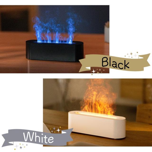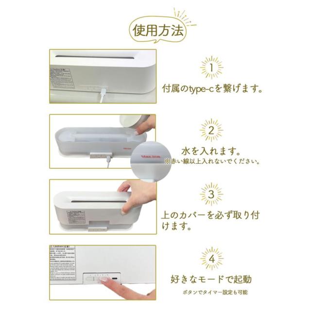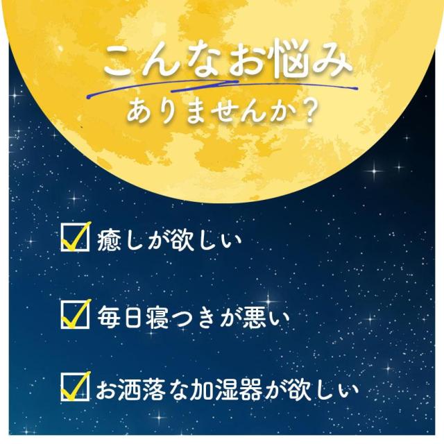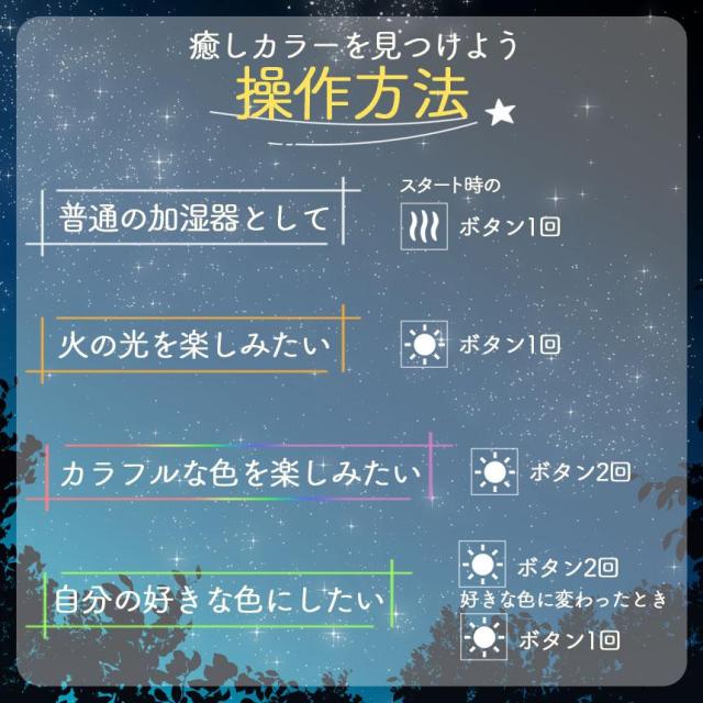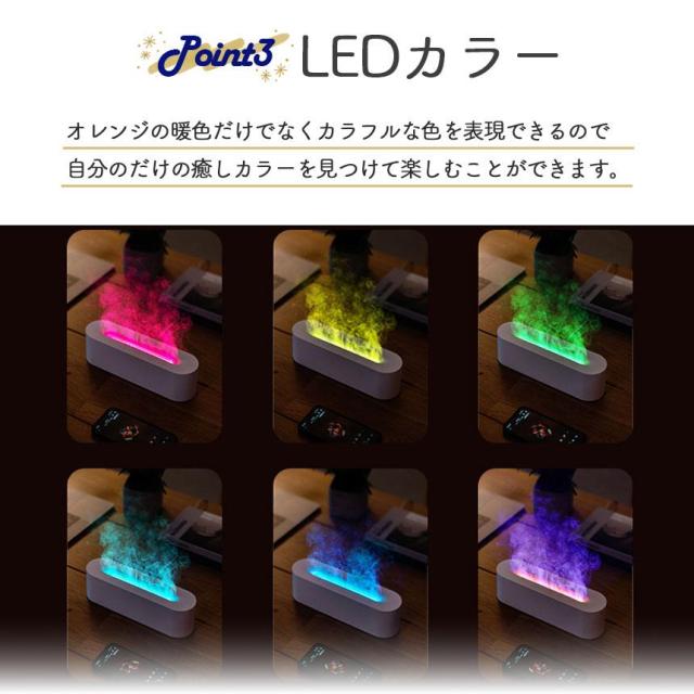 横長の吹き出し口からワイドに広がるミストがLEDに照らされて焚き火のような演出を日々の疲れも乾燥もこの1台で