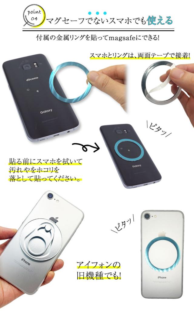 MagSafeに対応していないケースや機器には、付属の金属リングを貼り付けることにより本製品を使用することが出来ます。