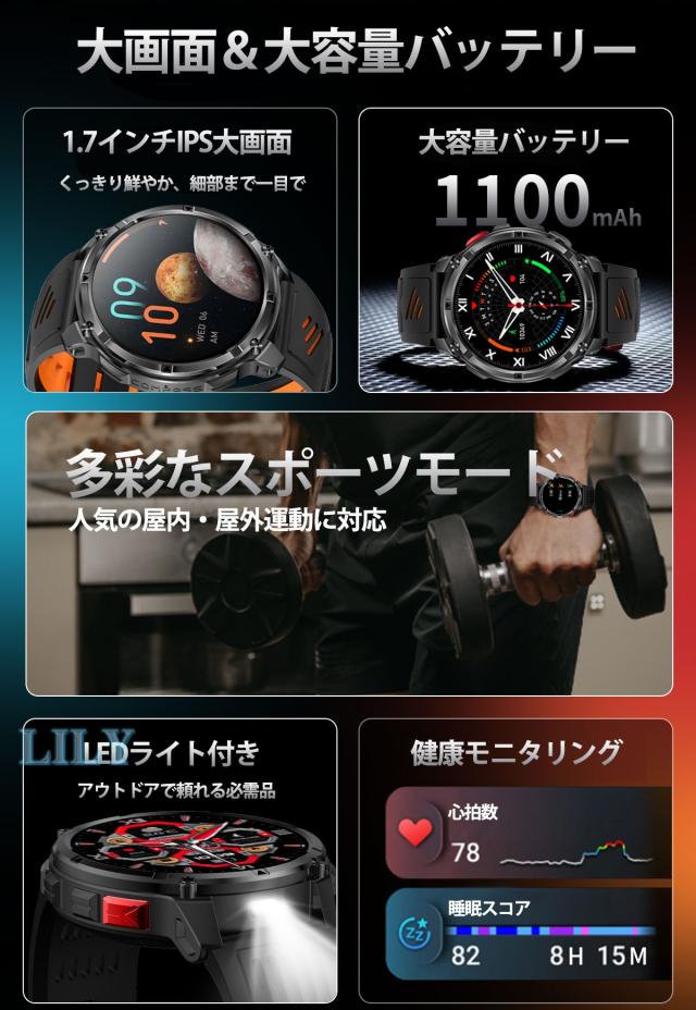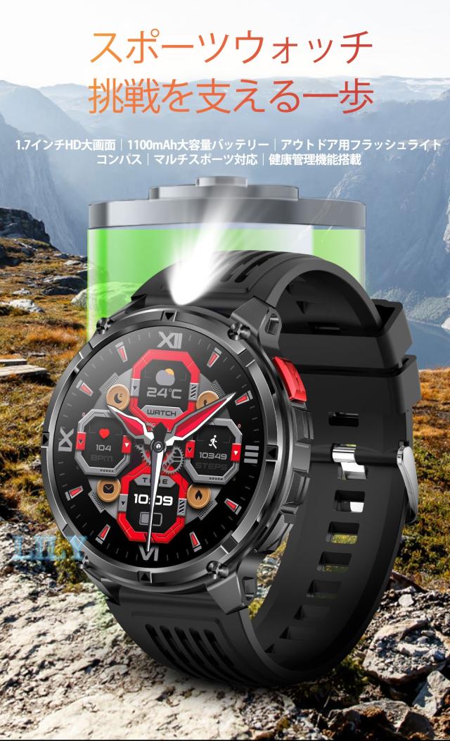 スマートウォッチ 日本製センサー 長持ち 1100mAhバッテリー 懐中電灯 丸型 血中酸素 高精度心拍数 IP68防水 Bluetooth通話機能 1.7インチ 着信通知 腕時計 健康管理 メンズ レディース プレゼント 父の日 母の日 敬老の日 誕生日 ギフト