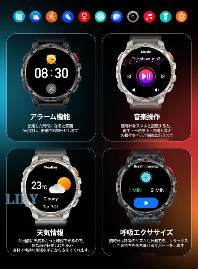 スマートウォッチ レディース メンズ 通話機能 line対応 iphone対応 android対応 登山 着信通知 心拍計 血中酸素 健康管理 運動記録 歩数計 睡眠モニター 防水 防塵 長時間バッテリー 音楽再生 音楽操作 音声アシスタント GPS 小型 薄型 軽量 高解像度 大画面 カスタム文字盤 ペアリング簡単 日本語対応 アプリ連携 プレゼント 父の日 母の日 敬老の日 学生向け 初心者向け ビジネス カジュアル ファッション おしゃれ 人気 ランキング 安い コスパ 最新モデル bluetooth5.2 6色 シンプルデザイン 多機能 健康管理アプリ 心拍センサー 血中酸素測定 スマホ連動 通知機能 歩数計測 睡眠分析 活動量計 防汗 スポーツモード 防塵防水 軽量設計 長時間使用 簡単操作 高感度タッチパネル 多彩な文字盤 着せ替え可能 バッテリー持ち良い 目覚まし機能 座りすぎ防止 リモートカメラ