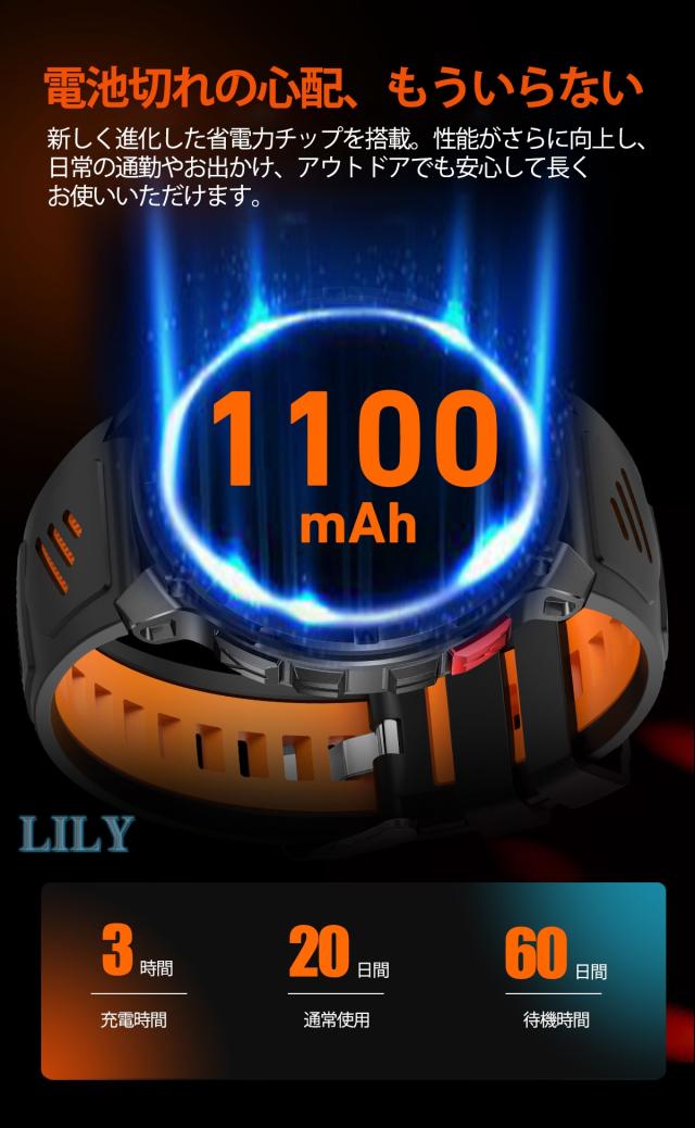 一般的なスマートウォッチの電池容量(200〜400mAh程度)を大きく上回る、1100mAhの大容量バッテリーを搭載。通常使用なら約10〜15日間、省電力モードでは最大30日間前後の連続使用が可能です。頻繁な充電から解放され、旅行や出張、アウトドアでも安心してご利用いただけます。