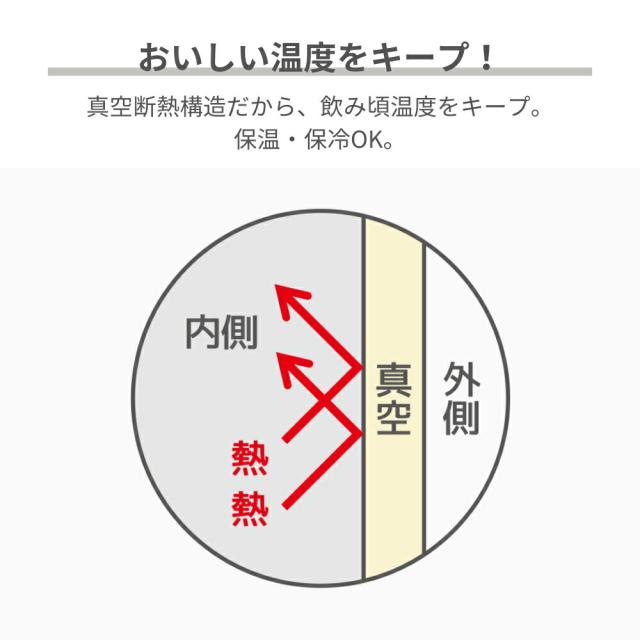真空断熱構造だから、飲み頃温度をキープ。保温・保冷OK。
