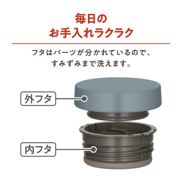開けやすいクリックオープン構造や、口当たりの良い丸口形状で、使用感も抜群です。また、内フタには水抜き穴がついており、洗浄後に水がたまりにくい工夫が施されています。