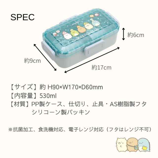ふわっと盛り付けられる形状が特徴で、仕切りが付いているため、ごはんとおかずを分けて持ち運べます。 ランチタイムが楽しくなる可愛い癒しのデザインで、ちいさなお子様はもちろんのこと、すみっコぐらしファンにも嬉しいお弁当箱です。