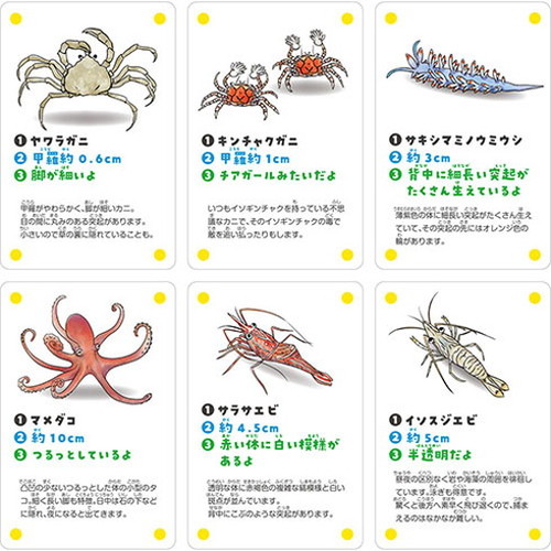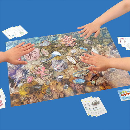 かるたで遊びながら海辺の生き物を知ることができます。磯の様子を表現した海辺のシート付!本物サイズのいきものカード!