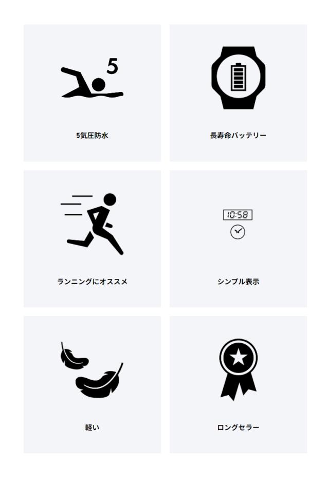 トレーニング中など時計を見なくてもボタン操作がしやすいブラインドオペレーション構造を採用し、ラップメモリー60やカウントダウンタイマーなどを搭載しています。また腕を傾けるだけで発光するオートLEDライトが装備され、暗所での時刻確認に便利です。