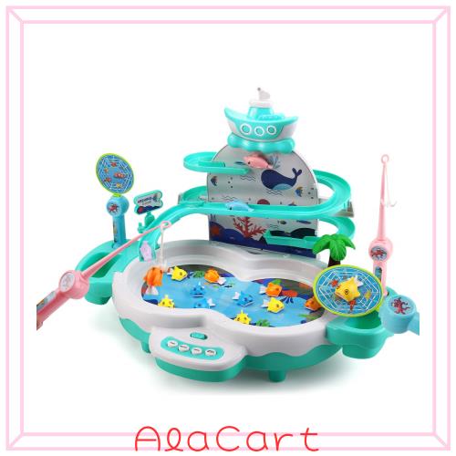 【磁気駆動式】魔法のような可変スライドを備えたフィッシングゲームトイ。磁気駆動により、魚はお水なしでも、泳ぐこと&下のレールから上のレールへ「飛ぶ」ことができ、音楽とともに回転することもできます。魚釣りごっこを楽しめましょう!