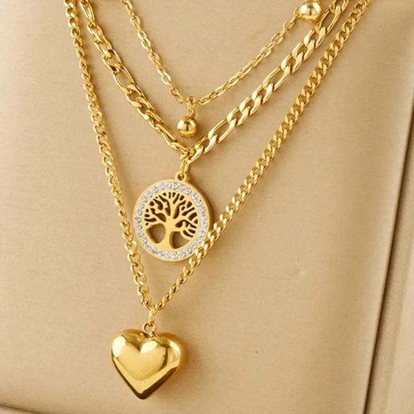 女性のためのハートツリーペンダント付きネックレス,ゴールドカラー,クリスタルストーン,ラウンドクロスチャーム,ダブルレイヤー,トレンディなジュエリー