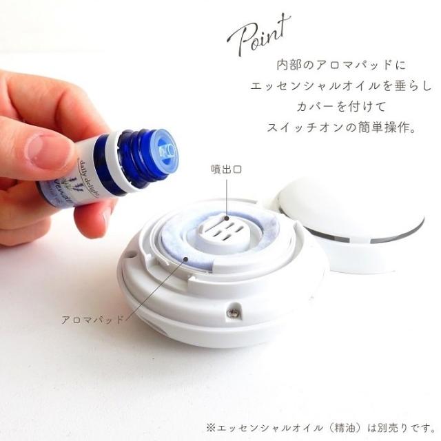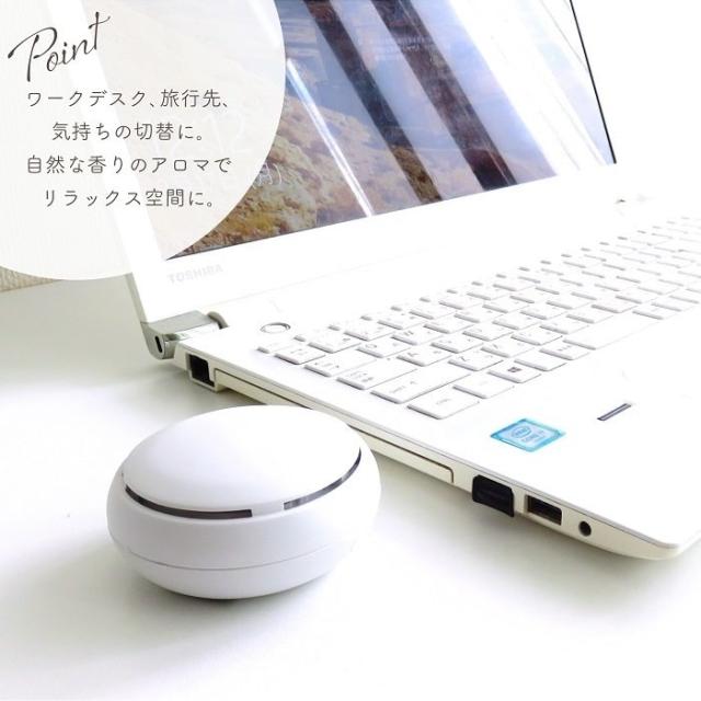 好きな香りを持ち運べる、充電式でどこでも一緒、ポケットサイズのディフューザー。コードレスでコンパクトにどこでも使えてアロマがもっと身近に。 本体内部のアロマパッドにオイルを垂らして、トップカバーを取り付けてスイッチを押すだけの簡単操作。持ち運びに便利な専用ポーチ付きなのもウレシイ。